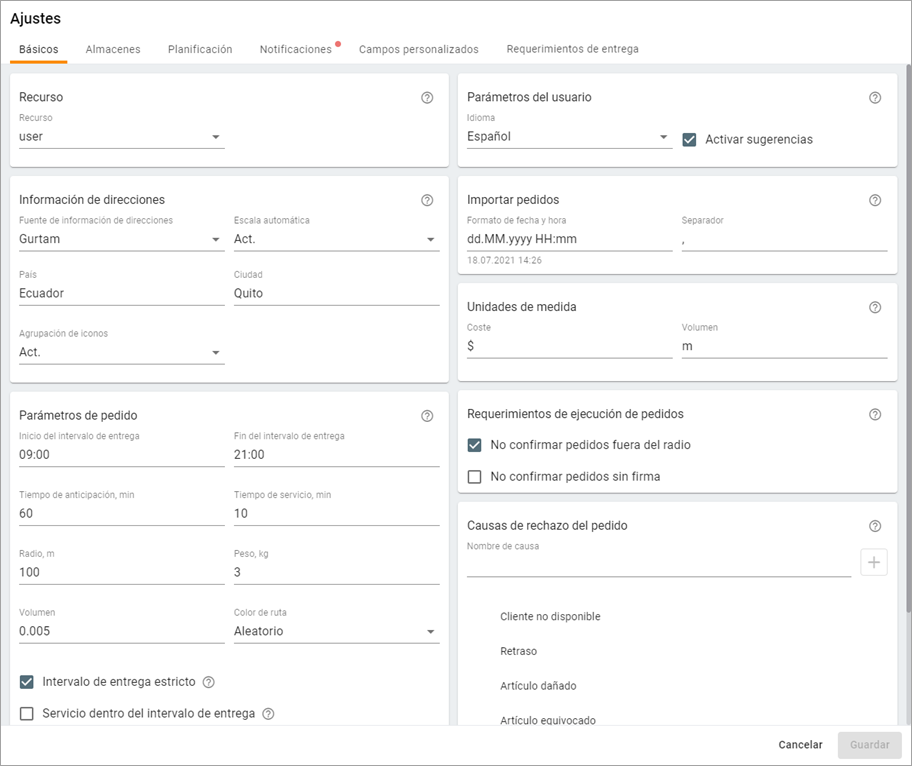 | Básicos | La selección del recurso, el mapa, las unidades de medida, los parámetros de pedidos por defecto. |
