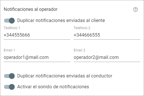 Para ello, tiene que activar la opción Duplicar notificaciones enviadas al cliente e ingresar la dirección de correo electrónico y/o número telefónico del operador. Puede indicar al mismo tiempo dos direcciones y dos números telefónicos.