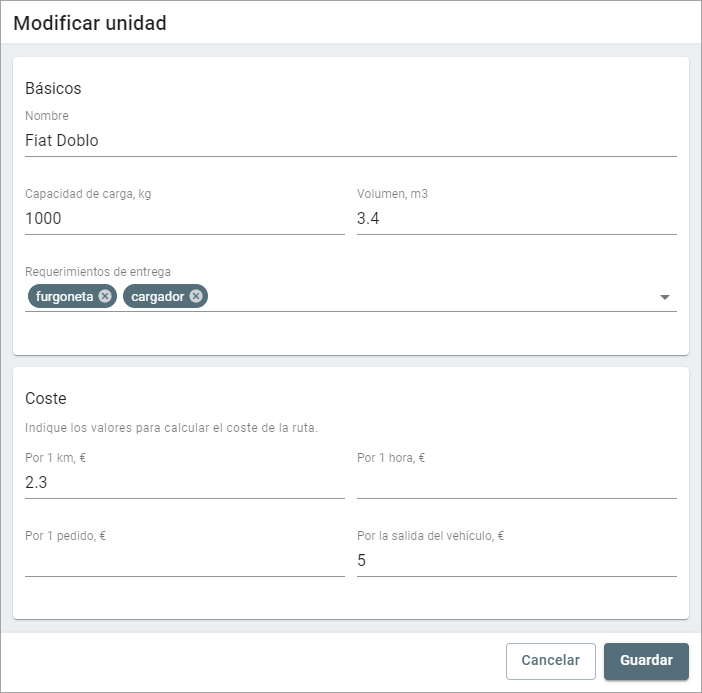 En la sección Coste, puede indicar el coste por un kilómetro, una hora, un pedido o salida de una unidad.