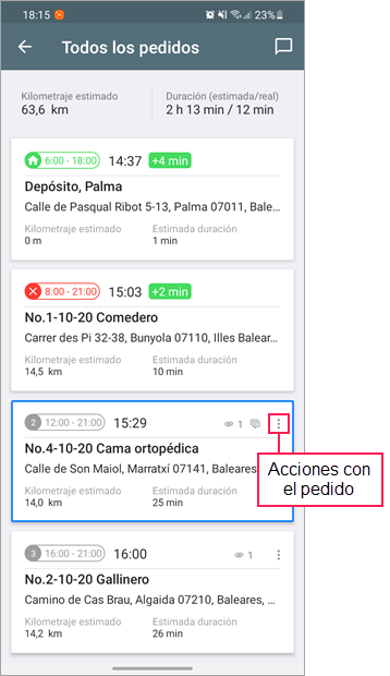 Después de apretar la tarjeta de una ruta, se abre la lista de todos los puntos contenidos (incluyendo almacenes) en esta ruta. Aquí puede ver la información sobre los puntos de la ruta, actualizar su estado y realizar otras acciones.