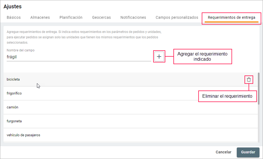 En esta pestaña se puede añadir los requerimientos de entrega que después pueden ser seleccionados en los parámetros de pedidos y en las propiedades de unidades. Al planear una ruta, para realizar pedidos se escogen solo aquellas unidades cuyos requerimientos coinciden con los requerimientos de pedidos.