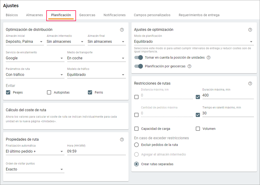 Los ajustes en esta sección influyen en el nivel de gastos relacionados con la ejecución de rutas. Asimismo, aquí se encuentran las opciones que permite tomar en cuenta la posición de unidades y su vinculación con geocercas durante la planificación.