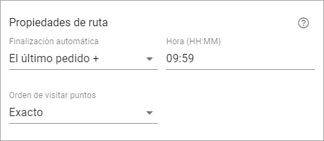 A la hora indicadaLa ruta se completa a la hora indicada en el campo Hora. Si el último pedido se completa más tarde, la ruta se completa a la misma hora del día siguiente.