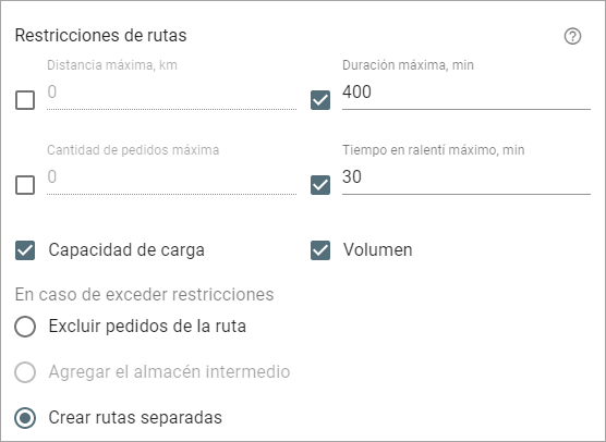 En esta sección se puede configurar las restricciones de las rutas y las unidades que las realizan. Si no se puede construir una ruta sin exceder una restricción, en el algoritmo de construcción de rutas se agrega la acción indicada abajo.