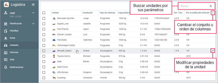 Los valores en los campos Nombre, Capacidad de carga y Volumen pueden ser modificados también en el sistema de rastreo en las propiedades de una unidad.