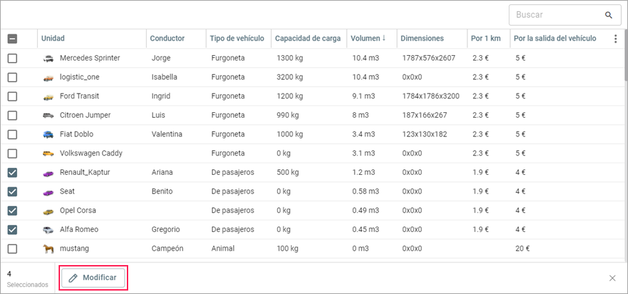 Si tiene que indicar valores iguales de propiedades para varias unidades, márquelas en la tabla y apriete el botón Modificar en la parte inferior de la ventana.