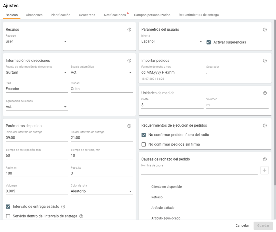 En los ajustes de la aplicación se puede escoger las unidades de medida, el mapa y el algoritmo de planificación de rutas, configurar notificaciones, crear almacenes, campos personalizados para los pedidos, etc.
