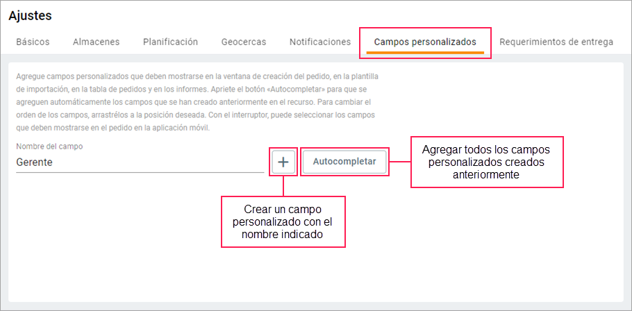 Esta pestaña sirve para trabajar con campos personalizados que deben mostrarse por defecto en todos los pedidos que se crean.