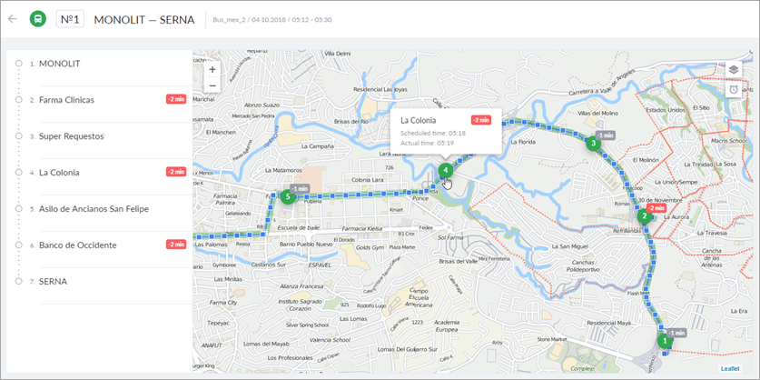 frente a la rutina necesaria. A la izquierda del mapa está la lista de paradas. En el caso de la desviación del horario, frente a las paradas visitadas se muestra el tiempo de adelantamiento o atraso (de acuerdo con los parámetros indicados en el bloque Seguimiento de los ajustes). Las paradas omitidas están marcadas con el icono