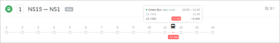 - el número y nombre de la última parada visitada y hora en que la unidad ha estado en esta parada;