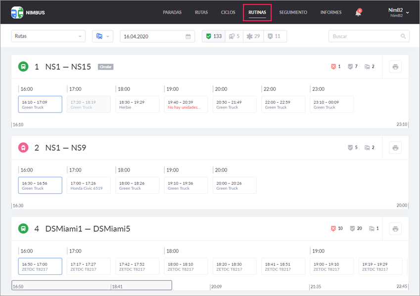 El sistema crea rutinas para la fecha seleccionada automáticamente a base de las rutas creadas, sus horarios y esquemas de operación. Cada rutina se muestra en forma de una tarjeta que tiene indicada la información básica sobre la misma.