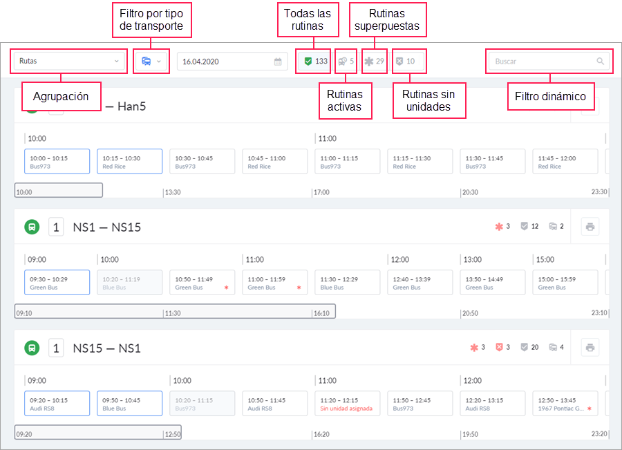 En caso de agrupación por rutas, en la tarjeta de la rutina se muestra el horario y la unidad asignada; en caso de agrupación por unidades, el horario y la ruta; en caso de agrupación por ciclos, el horario del ciclo y la unidad asignada al mismo. Si las rutinas están agrupadas por rutas o ciclos, se puede aplicar también el filtro por tipo de transporte que está a la derecha de la selección del modo de agrupación.