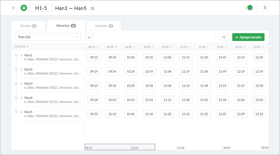 En la segunda pestaña de las propiedades de la ruta se crea la tabla de sus horarios que contiene todas las salidas a la ruta indicado el tiempo de pasar por las paradas. A base de los horarios en los días programados se crean rutinas automáticamente.