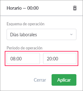 El esquema de operación determina los días en que el horario tiene que estar activo. Por ejemplo, un horario tiene que operar los fines de semana, otro, solo en el verano, etc. Si no está indicado el esquema de operación, el horario se ejecuta diariamente sin restricciones.