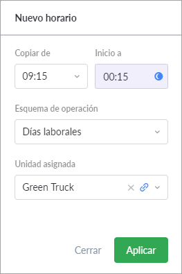 Se recomienda indicar una unidad si realiza rutinas por este horario constantemente. En este caso el despachador no tendrá que asignar una unidad manualmente cada vez, se asignará automáticamente cada vez que se active una rutina.