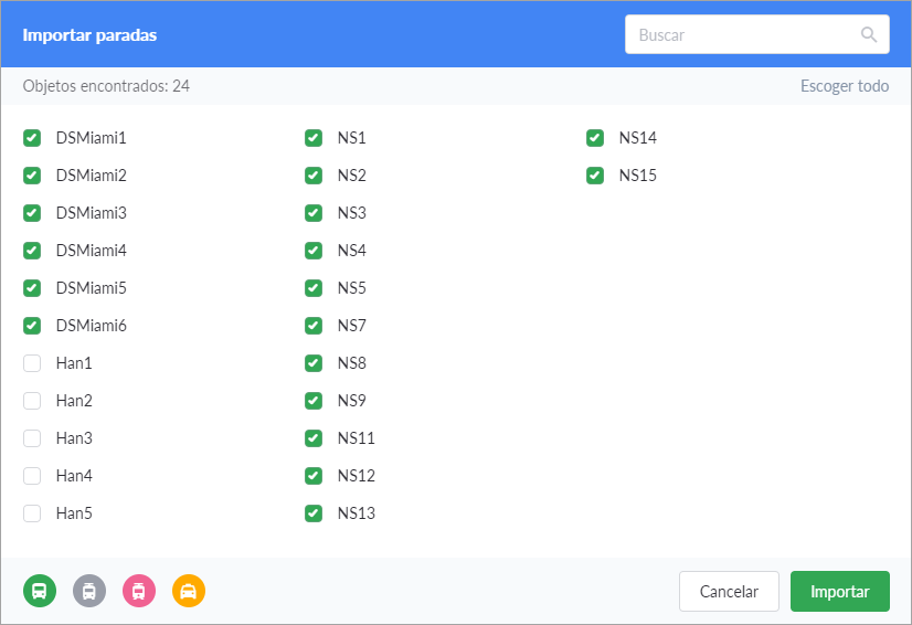 Por defecto están marcados todos los elementos disponibles. Sin embargo, usted puede seleccionar solo las paradas que hay que importar en el momento. Para seleccionar o quitar la selección de todos los elementos al mismo tiempo, apriete Escoger todo/Restablecer selección en el rincón derecho superior del diálogo.