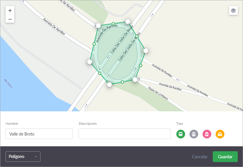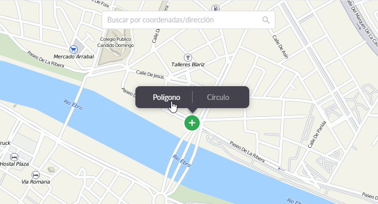Para crear una parada manualmente, mueva el mapa hacia la posición necesaria y haga clic derecho o utilice la búsqueda por coordenadas/dirección en la parte superior del mapa. Escoja círculo o polígono en el menú desplegable de acuerdo con la forma de parada necesaria (se puede cambiar el tipo en la ventana de parámetros de parada). Un círculo se crea más rápido, pero el polígono permite precisar la forma mejor.