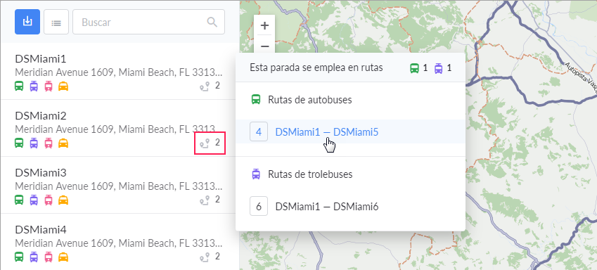 Las paradas creadas se muestran en forma de una lista en la parte izquierda de la ventana. Los datos sobre una parada incluyen su nombre, descripción (si hay), tipo (tipos) y la información sobre las rutas en que se utiliza. Al apuntarse a una parada en la lista, también aparecen botones de modificar o eliminarla.