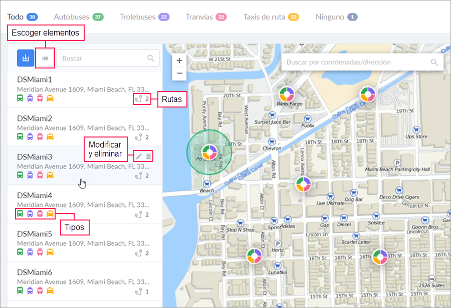 Para mover rápidamente a una parada en el mapa, apriételo en la lista. En el mapa la parada se muestra por medio de un icono redondo cuyos colores corresponden a los tipos de transporte elegidos. En la descripción emergente se muestran el nombre y la descripción de la parada. Una vez apretado el icono, aparecen los botones de modificar y eliminarla. También se muestra la forma de la parada en el foco.