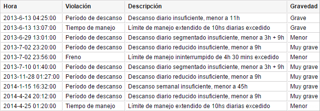 La tabla Violaciones muestra información sobre las infracciones del RTD.