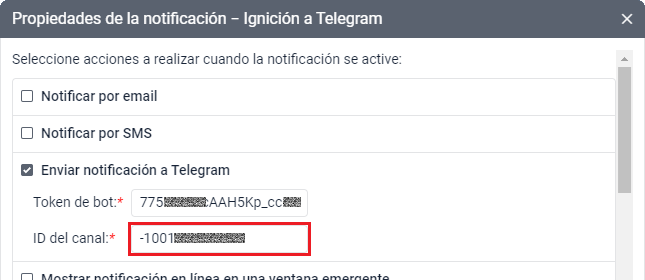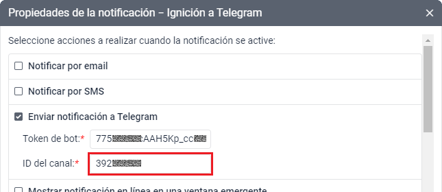 Como ID del canal para configurar la notificación en Wialon, es necesario usar el ID del canal: