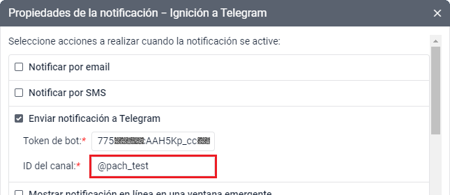 Tomamos solo “pach_test” (sin los símbolos “t.me/”), ponemos el prefijo “@” y lo agregamos a la notificación en Wialon:
