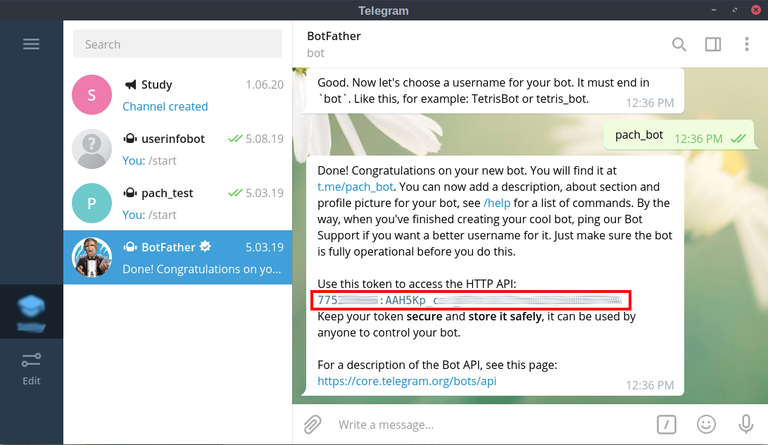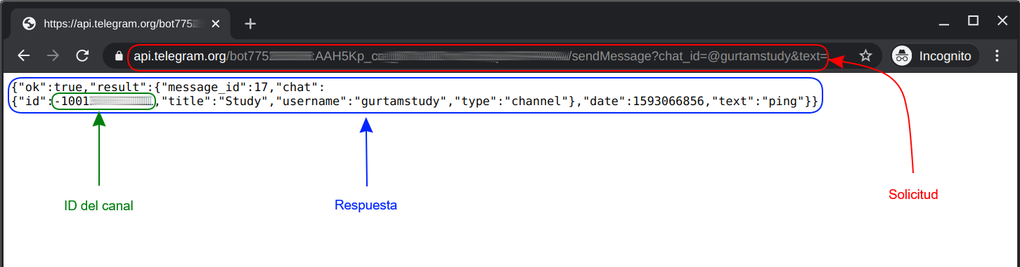 {"ok":true,"result":{"message_id":17,"chat":{"id":-1001xxxxxxxxx,"title":"Study","username":"gurtamstudy","type":"channel"},"date":1593066856,"text":"ping"}}