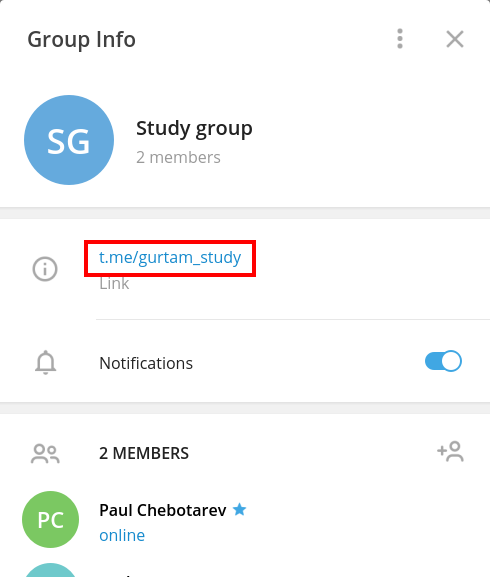 Creamos un grupo abierto, agregamos allí el bot (puede ser sin derechos de administrador). Enviamos una solicitud en nombre del bot a este grupo, insertando el siguiente enlace en la barra de direcciones del navegador y presionando Enter: