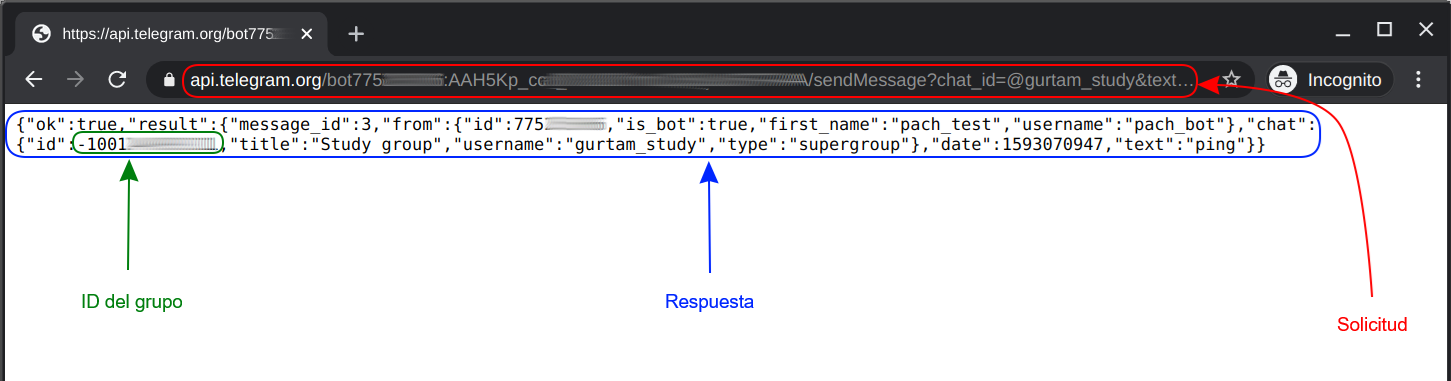 {"ok":true,"result":{"message_id":2,"from":{"id":775ххххххх,"is_bot":true,"first_name":"pach_test","username":"pach_bot"},"chat":{"id":-1001xxxxxxxxx,"title":"Study group","username":"gurtam_study","type":"supergroup"},"date":1593070025,"text":"ping"}}