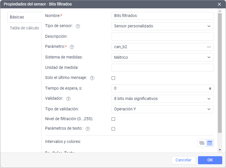 Crear un Sensor personalizado con el nombre Bits filtrados basado en el parámetro can_b2. Luego seleccionar el sensor 8 bits más significativos como validador y elegir el tipo de validación Operación Y.