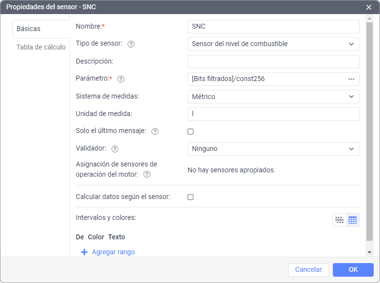 Crear un Sensor personalizado con el nombre SNC incorporado, basado en el parámetro fuel_lvl.