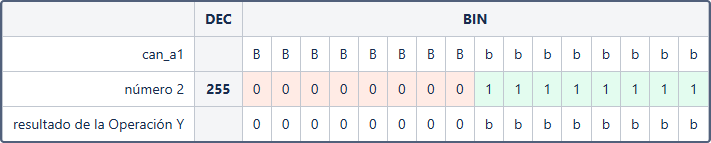 Como resultado, usando la representación binaria del número 255 se realizó un filtrado del parámetro can_a1 de tal manera que solo quedaron los 8 bits menos significativos.