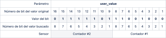 Como ejemplo, consideremos el parámetro user_value con el valor (DEC) 32200 = (BIN) 0111 1101 1100 1000. Su primer byte describe el valor del primer contador, y el segundo byte, el valor de otro contador. Es necesario crear dos sensores separados con fórmulas que usarán solo los bytes necesarios.