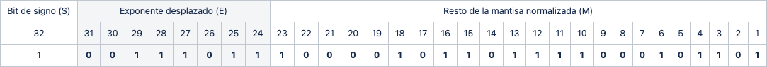 donde d es el número en el sistema decimal, S es el signo del número, E es el exponente desplazado, M es el resto de la mantisa normalizada.