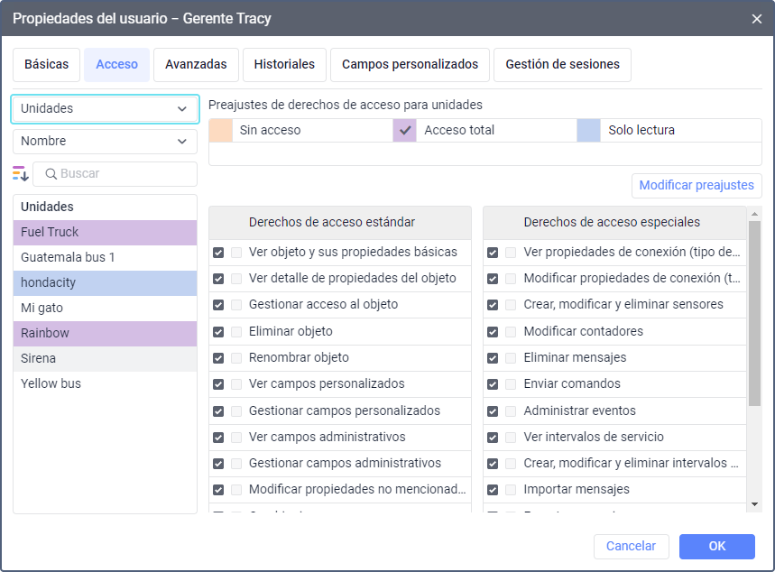 Los derechos de acceso a la unidad permiten al usuario ver la ubicación de esta unidad en el mapa, seguir sus parámetros (velocidad, altitud, valores de sensores, etc.), enviar comandos y mensajes a ella, emplear la unidad en informes, notificaciones, tareas y realizar otras operaciones.
