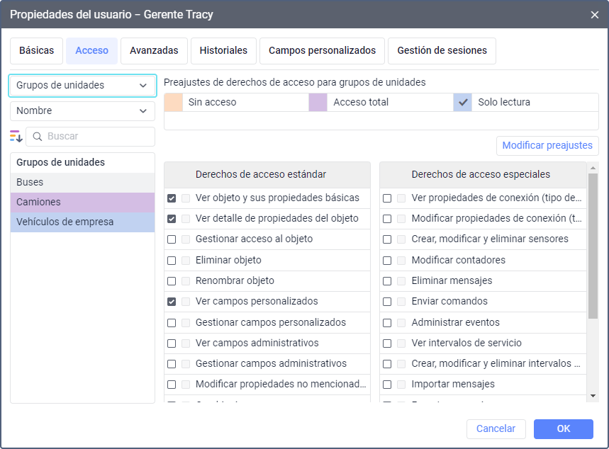 Los derechos de acceso a un grupo de unidades permiten al usuario ver este grupo en diferentes listas, ejecutar informes por grupo, agregar o quitar unidades del grupo, eliminarlo, etc. Los derechos de acceso al grupo implican el acceso a todos las unidades que pertenecen al grupo. Esto significa que el usuario que tiene acceso al grupo puede realizar diferentes operaciones con todas sus unidades.