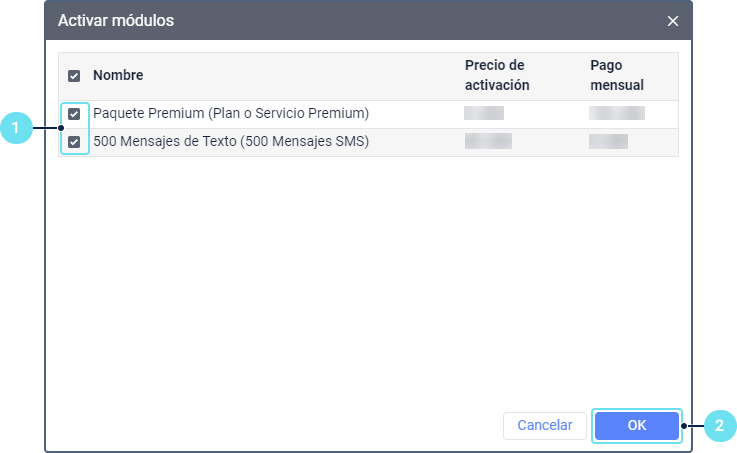 En la lista de los módulos disponibles, seleccione aquellos que quiere activar. Haga clic en OK y confirme la acción en una ventana emergente.