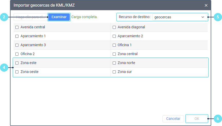 Esta función permite copiar geocercas de un archivo de formatos KML o KMZ a un recurso.