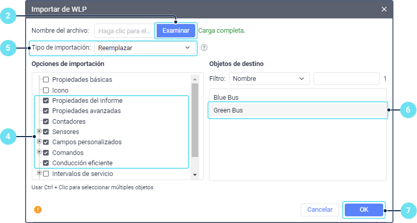 Esta función permite copiar propiedades de unidad, contenido de recurso o parámetros de usuario de un archivo WLP al objeto del tipo correspondiente: unidad, recurso o usuario. Para utilizar esta función, se necesita un archivo WLP previamente guardado.