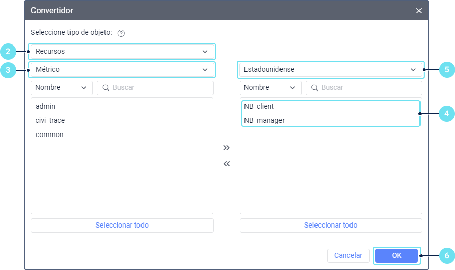 En la lista desplegable, escoja el tipo de objeto para el que quiere realizar la conversión: unidades, recursos, usuarios o rutas. Vea detalles sobre particularidades de conversión para cada tipo a continuación.