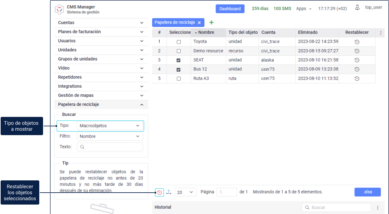 Los objetos se almacenan en la papelera durante 30 días después de su eliminación y durante este tiempo puede restablecerlos si es necesario.