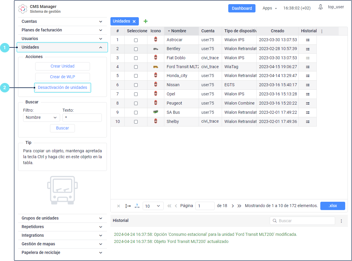 Mientras una unidad está desactivada, el sistema no recibe nuevos datos (mensajes) de ella. Sin embargo, los datos recibidos antes de la desactivación se almacenan durante el período histórico establecido para la cuenta.