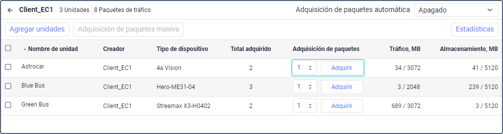 Para adquirir paquetes de tráfico para una unidad, indique su cantidad en la columna Adquisición de paquetes y apriete el botón Adquirir. Se puede introducir la cantidad manualmente o usar los botones en forma de flechas. El valor máximo permitido es 99.