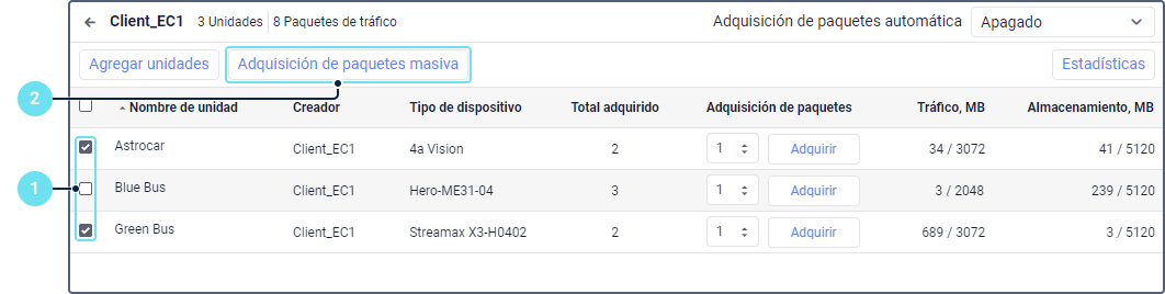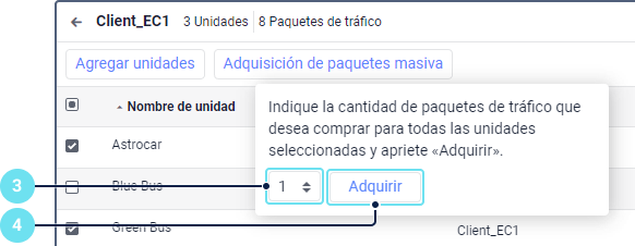Marque las unidades para las cuales se necesita comprar paquetes de tráfico. Para marcar todas las unidades, ponga un visto al lado del encabezado Nombre de unidad.