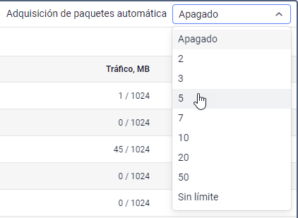 Por defecto, la adquisición automática está desactivada. Para activarla, escoja la cantidad de paquetes mensual máxima (límite) que puede comprarse para cada unidad. Asimismo puede seleccionar la opción Sin límite.