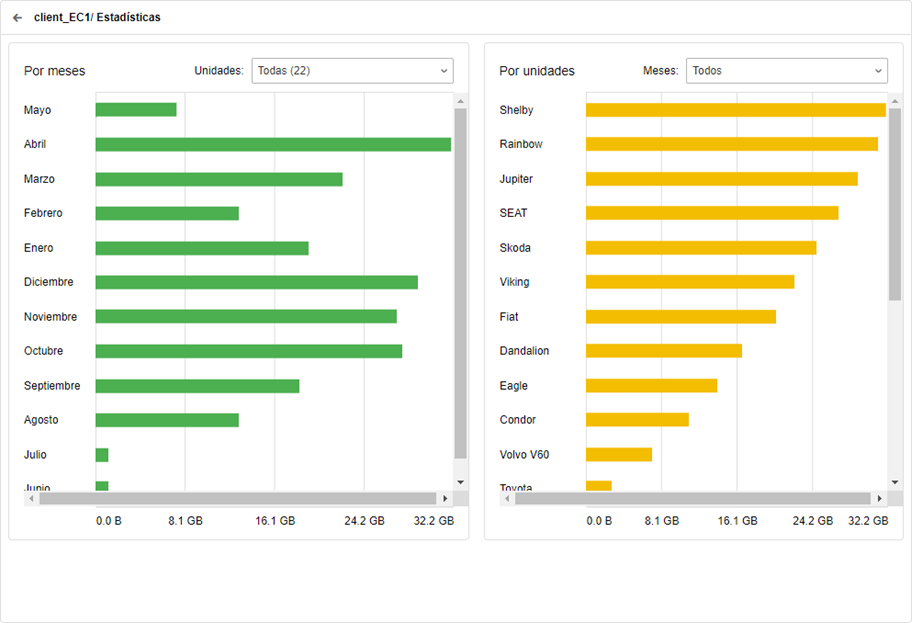 Se puede ver las estadísticas del uso de tráfico por cada cuenta. Para hacerlo, apriete el botón Estadísticas sobre la tabla de las unidades. En la ventana se muestran dos gráficas: por meses y por unidades.