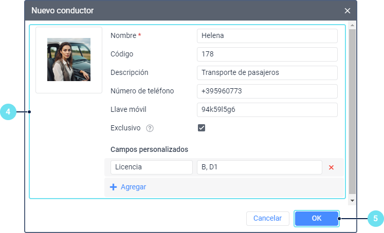 | Fotografía | Fotografía del conductor u otra imagen. Se muestra en la descripción emergente del conductor y se emplea como icono para designar al conductor en la lista y en el mapa. Para cargar el archivo, haga clic en el área de fotografía y escoja el archivo en el disco. Se admiten los formatos PNG, JPG, GIF y SVG. Se recomienda cargar fotografías cuadradas. Para eliminar una fotografía cargada, apúntela con el cursor y haga clic en el icono . |