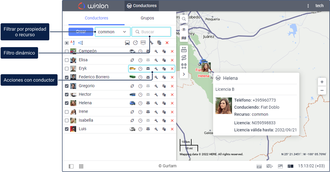 Para que un conductor se muestre en el mapa, márquelo en la lista. Previamente, asegúrese de que la capa de conductores está activada.