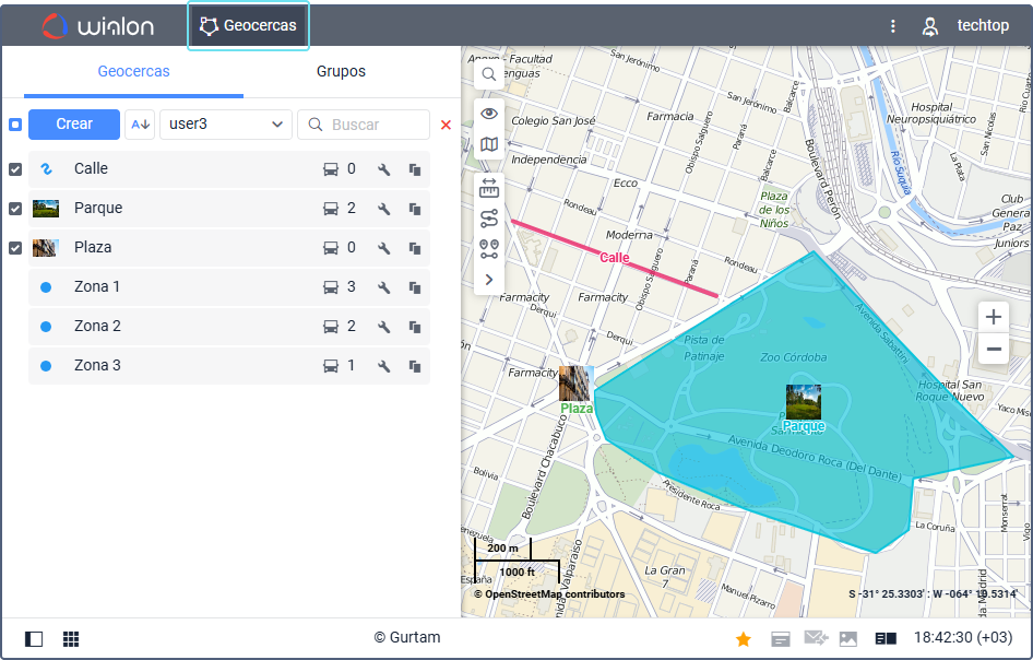 Para ir a la pestaña, haga clic en su nombre en la barra superior o seleccione el elemento Geocercas en la ventana de configuración del menú. En esta pestaña, puede crear geocercas y grupos de geocercas, así como modificar, copiar y eliminarlas (para más información, consulte Gestión de geocercas).