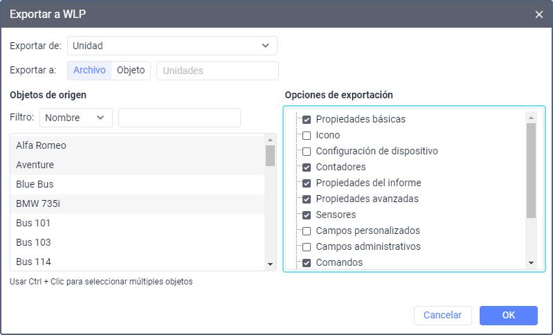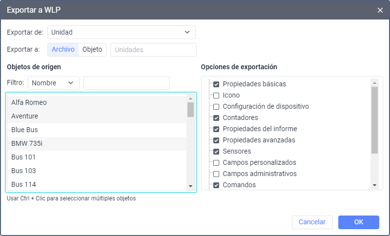 En este tipo de listas se puede escoger varios objetos de una vez. Para hacerlo, apriete Ctrl y marque los objetos necesarios consecutivamente.